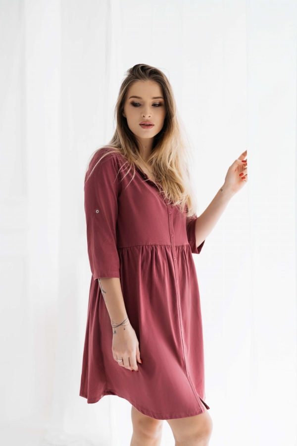 Koszula nocna dla kobiet w ciąży i karmiących piersią. Koszula o kroju modnej sukienki z rękawem 3/4. Marszczenie pod biustem sprawia, że pięknie podkreśla ciążowy brzuszek i zapewnia wygodę podczas snu nawet w zaawansowanej ciąży. Specjalnie skonstruowany dekolt pozwala na szybkie dostawienie Maluszka do piersi, a rozpięcie po całej długości zapewni wygodę podczas przebierania się po cesarskim cięciu.