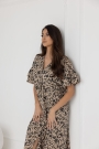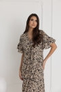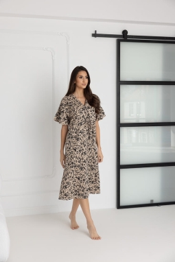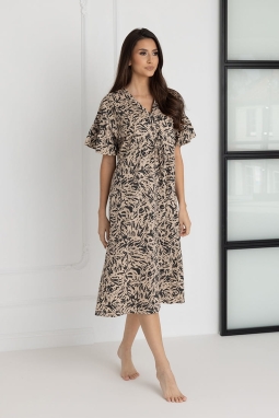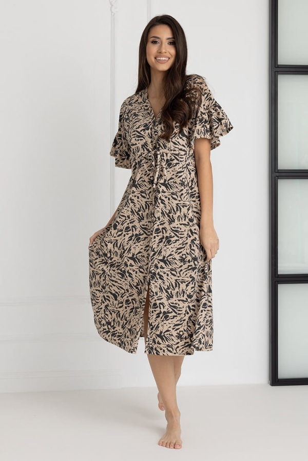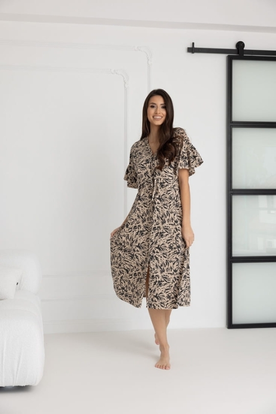 Koszula zachwyca przemyślanym krojem – krótki rękaw w stylu kimona, zakończony subtelną falbaną, dodaje lekkości i kobiecego uroku. Długość sięgająca połowy łydki to idealne rozwiązanie dla kobiet ceniących subtelną elegancję i komfort. Dekolt w szpic, zapinany na bezniklowe napy, ułatwia szybki dostęp do piersi, co czyni koszulę niezastąpioną podczas karmienia.