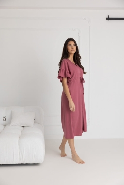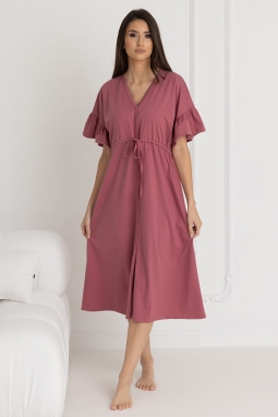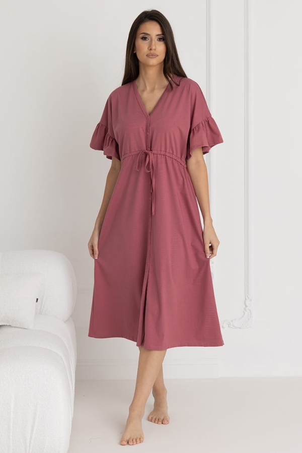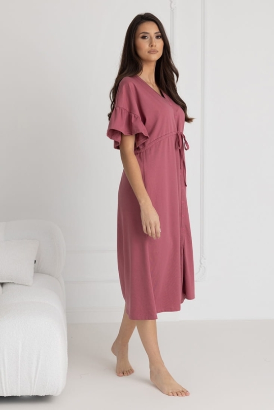 Koszula zachwyca przemyślanym krojem – krótki rękaw w stylu kimona, zakończony subtelną falbaną, dodaje lekkości i kobiecego uroku. Długość sięgająca połowy łydki to idealne rozwiązanie dla kobiet ceniących subtelną elegancję i komfort noszenia. Dekolt w szpic, zapinany na bezniklowe napy, ułatwia szybki dostęp do piersi, co czyni koszulę niezastąpioną podczas karmienia.
