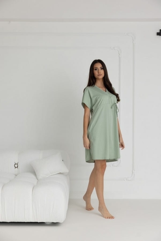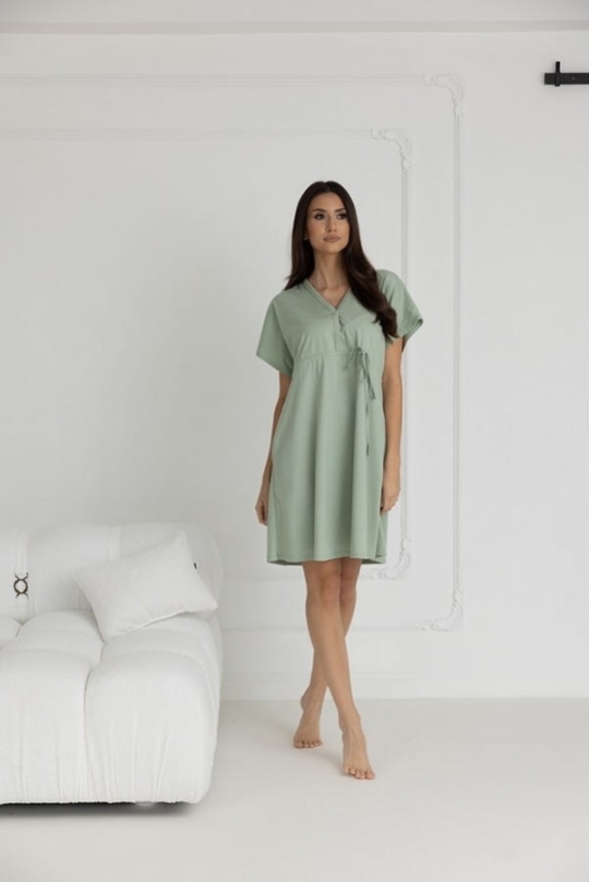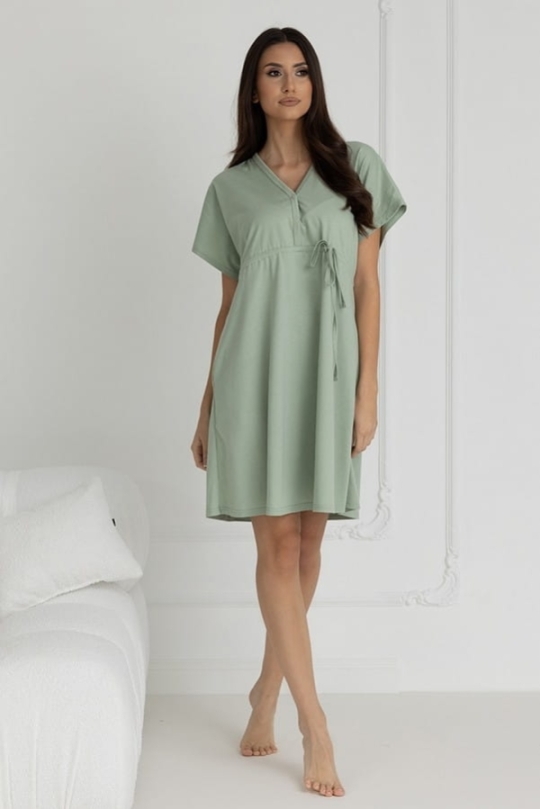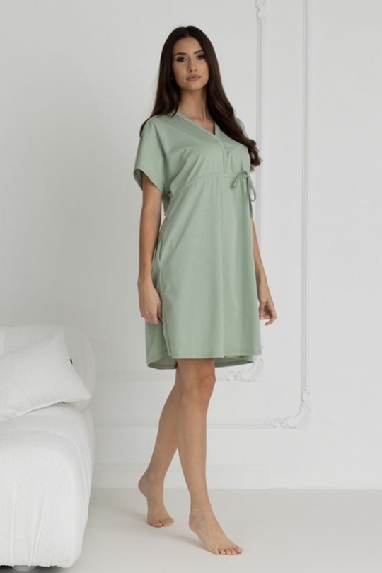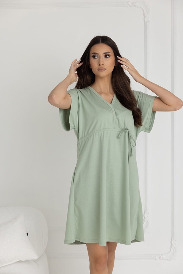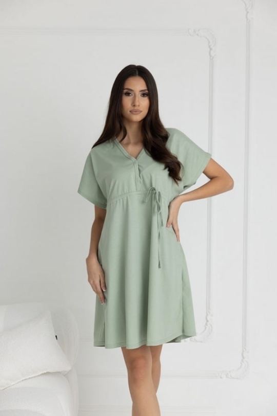 Jej krótki rękaw w stylu delikatnego kimona oraz długość do kolan sprawiają, że jest niezwykle wygodna i stylowa. Dekolt w szpic zapinany na napy to rozwiązanie, które sprawdza się doskonale podczas karmienia, umożliwiając szybki dostęp do piersi.