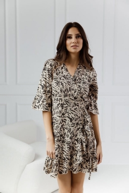 Wzór koszuli prezentowanej na zdjęciu z beżowo-czarnymi cętkami, inspirowany motywem zwierzęcym, dodaje całości dynamicznej elegancji. Subtelna gra kolorów tworzy efektowny kontrast, podkreślając jednocześnie dzikość i styl.