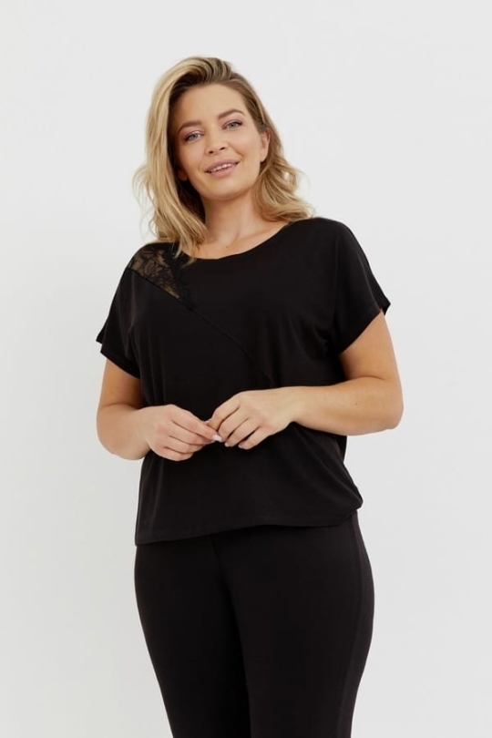 Koszulka posiada krótki rękaw zapewniający swobodę ruchów i oddychalność. Przód ozdobiony misterną wstawką koronki dodającą uroku i kobiecego wdzięku.