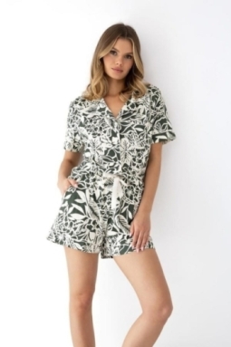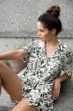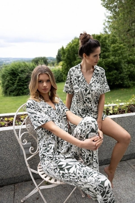 Piżama Kaylee od Sensis to elegancka i wygodna piżama damska łącząca klasyczny krój z subtelnym kwiatowym printem w kolorach khaki i ecru. Wykonana z wysokiej jakości wiskozy, jest miękka i przyjemna dla skóry.