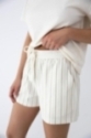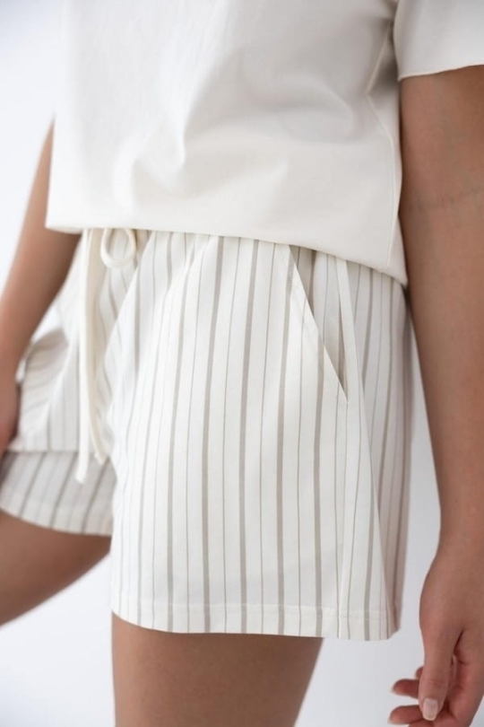 Koszulka z krótkim rękawem i półokrągłym dekoltem łączy wygodę z klasycznym krojem. Do kompletu spodenki z delikatnym paskowym printem, z gumką i troczkiem w pasie do regulacji.