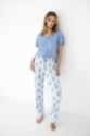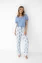Gładka, niebieska koszulka z krótkim rękawem prezentuje się klasycznie i świeżo. Dekolt zapinany na dwa guziczki dodaje uroku oraz pozwala regulować głębokość wycięcia. Do kompletu długie spodnie ze wzorem i gumką w pasie.