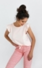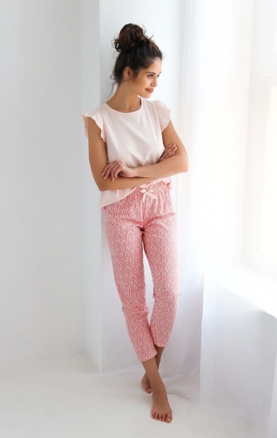 Koszulka z krótkim rękawem typu motylek oraz delikatnym półokrągłym dekoltem dodaje subtelności i kobiecego uroku. Długie spodnie z wzorzystej bawełny zapewniają wygodę i przytulność.