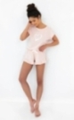 Górna część to koszulka z krótkim rękawem ozdobiona delikatnym nadrukiem na przodzie dodającym subtelnego uroku i dziewczęcego wdzięku. Dolna część to krótkie spodenki z falbanką, które nadają piżamie lekkości i charakteru.