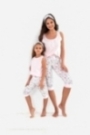 Piżama Sheena od polskiego producenta Sensis to dwuczęściowy komplet uszyty z miękkiej, przewiewnej bawełny w kolorze jasnego różu. Gładka koszulka na szerokich ramiączkach z okrągłym dekoltem zapinanym na guziczki uzupełniona jest wzorzystymi spodniami 3/4 zakończonymi ściągaczem w różowym kolorze. W pasie wygodna gumka z satynową kokardką. Piżama dostępna w rozmiarach S, M, L, XL.