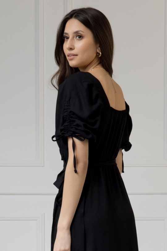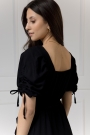 Dekolt w kształcie litery V pięknie podkreśli linię szyi i wyeksponuje biust w stopniu, o którym sama zadecydujesz. Dodatkowym atutem sukienki są niezwykle oryginalne bufiaste rękawy – posiadają one funkcję regulacji, a tym samym możliwość marszczenia w dowolnym stopniu. Dzięki temu rękaw staje się ozdobą, a troczki możesz zawiązać w kokardkę albo puścić luźno. Sukienka posiada też delikatne wycięcie z tyłu, dzięki czemu pięknie wyeksponuje Twoje plecy.