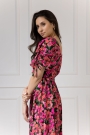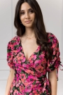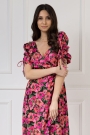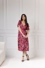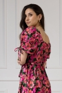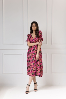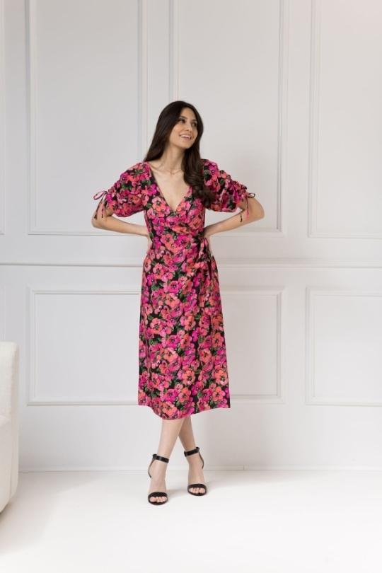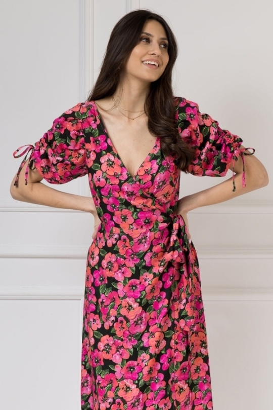 Dekolt w kształcie litery V pięknie podkreśli linię szyi i wyeksponuje biust w stopniu, o którym sama zadecydujesz. Dodatkowym atutem sukienki są niezwykle oryginalne bufiaste rękawy – posiadają one funkcję regulacji, a tym samym możliwość marszczenia w dowolnym stopniu. Dzięki temu rękaw staje się ozdobą, a troczki możesz zawiązać w kokardkę albo puścić luźno. Sukienka posiada też delikatne wycięcie z tyłu, dzięki czemu pięknie wyeksponuje Twoje plecy.