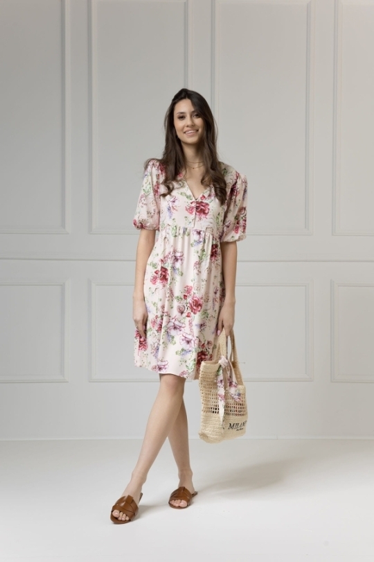 Sukienka EMILY to uniwersalny i niezwykle funkcjonalny model. Jej głównym założeniem jest komfortowy i wygodny krój, który idealnie sprawdzi się na co dzień. Sukienka z powodzeniem może być noszona przez kobiety w ciąży (nawet zaawansowanej) oraz Mamy karmiące. Subtelny dekolt w literę V wyposażony został w 2 rozpinane guziczki (karmienie niemowlęcia). Bufiaste krótkie rękawki zostały wykończone elastyczną gumką. Tuż pod biustem umiejscowione zostało odcięcie z elastyczną gumką, od którego dodatkowo na całym obwodzie wychodzą liczne ozdobne marszczenia tzw. kontrafałdy (miejsce na ciążowy brzuszek). Sukienka posiada dodatkowo funkcjonalne kieszenie.